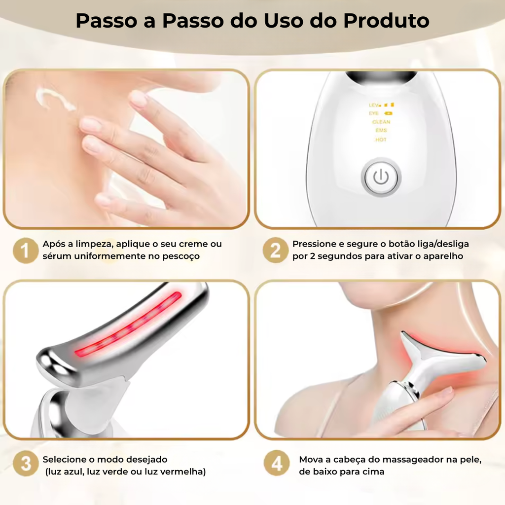 Seu novo aliado para reduzir rugas, firmar a pele e revitalizar o rosto em minutos. Com tecnologia de microcorrente, luz LED (vermelha, azul e verde) e calor inteligente, este aparelho portátil entrega lifting imediato, regeneração profunda e massagem terapêutica em um único dispositivo fácil de usar.